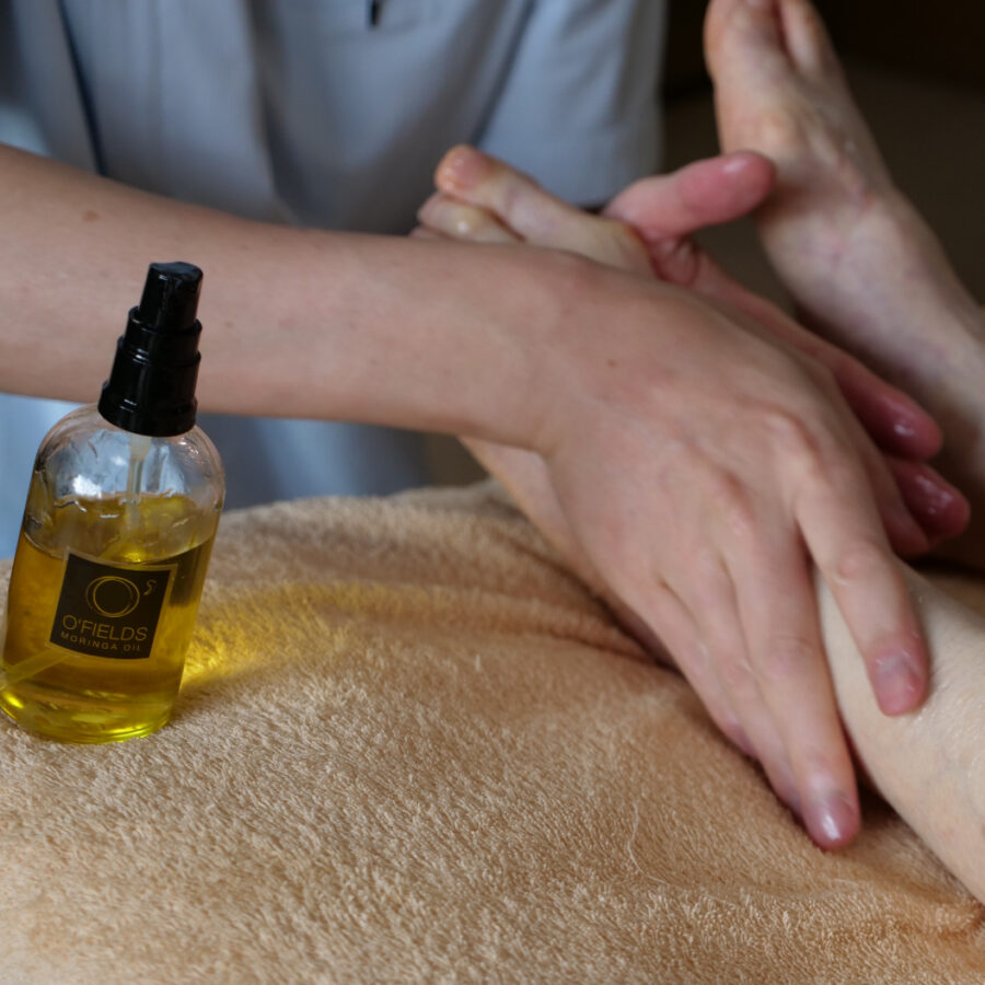 主に脚の浮腫み・痛みやだるさ改善の為、当院ではフットバス後に高品質のピュアモリンガオイルを使用し施術を行っております。オイルマッサージには、血行促進・冷えやむくみの改善・疲労回復・リラックス効果などに期待ができ心身へのサポートになります。
