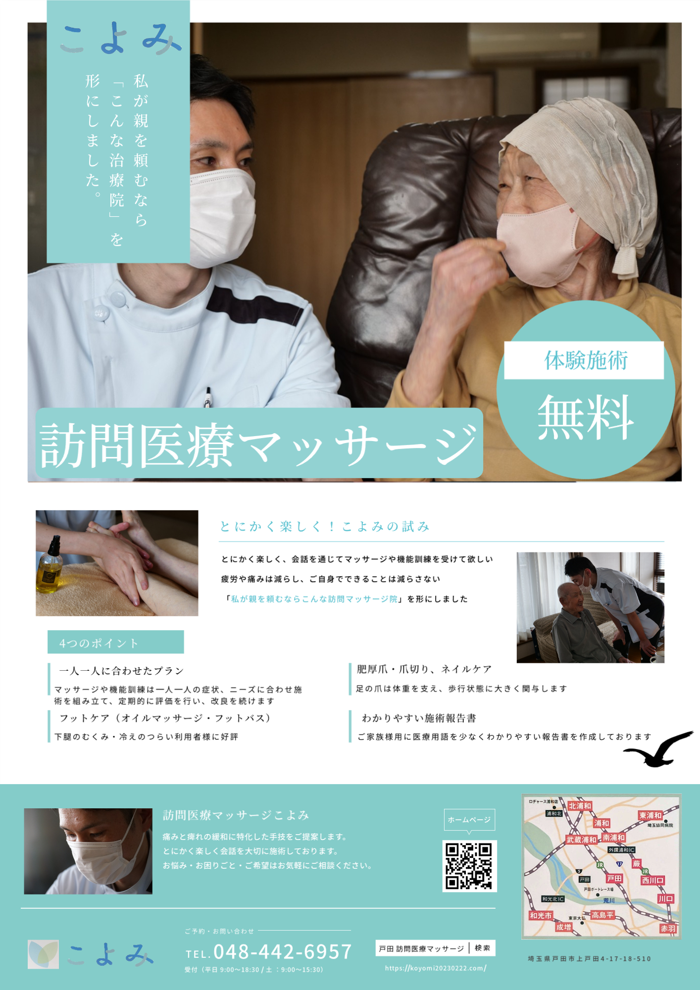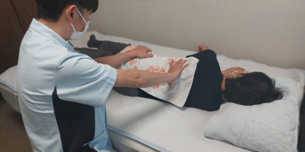 ご自宅、または施設にお伺いし30分程度のマッサージを行います。施術後に治療方針や料金、施術時間など詳しいご説明をいたします。