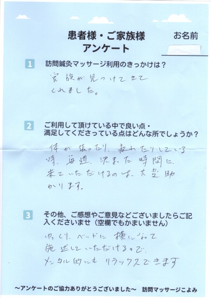 『車椅子自走により、両腕の筋肉の張りが辛いのですが施術後は軽くなります。』(ご本人様より)