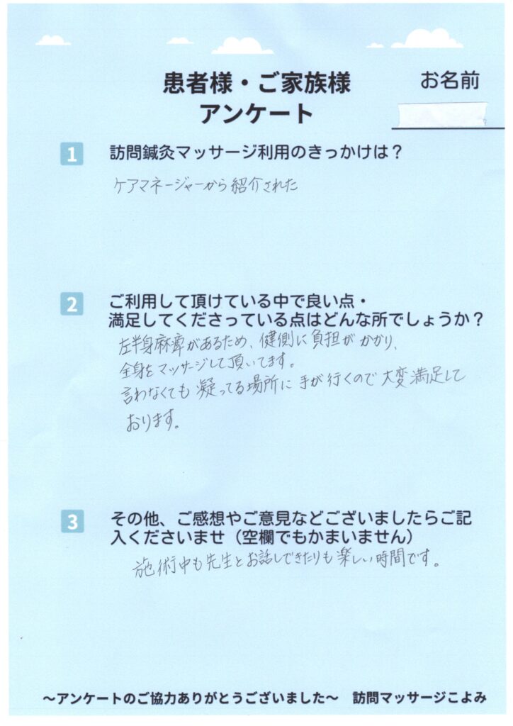 『片麻痺により負担のかかる部位をしっかり施術して頂けます』(ご本人様より)